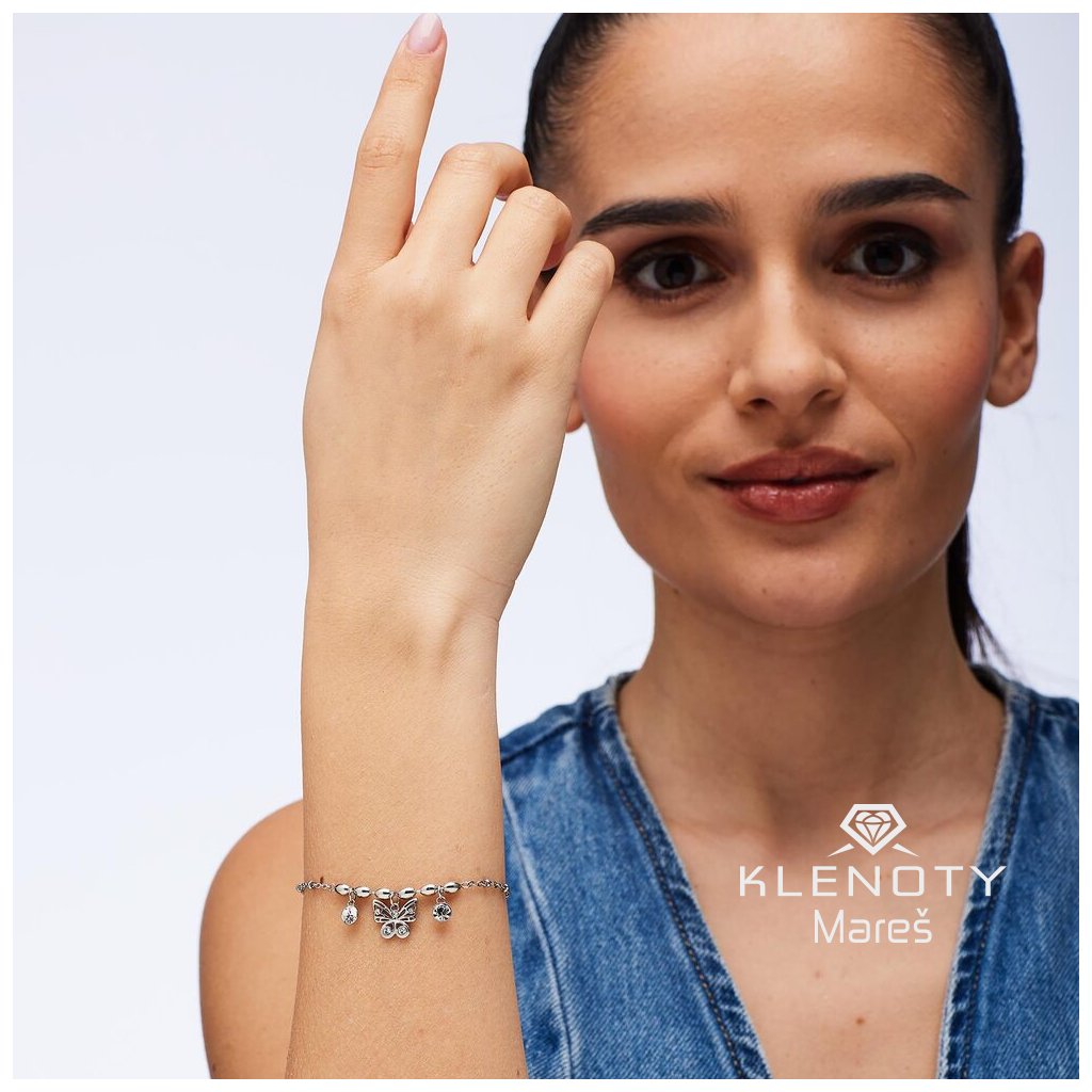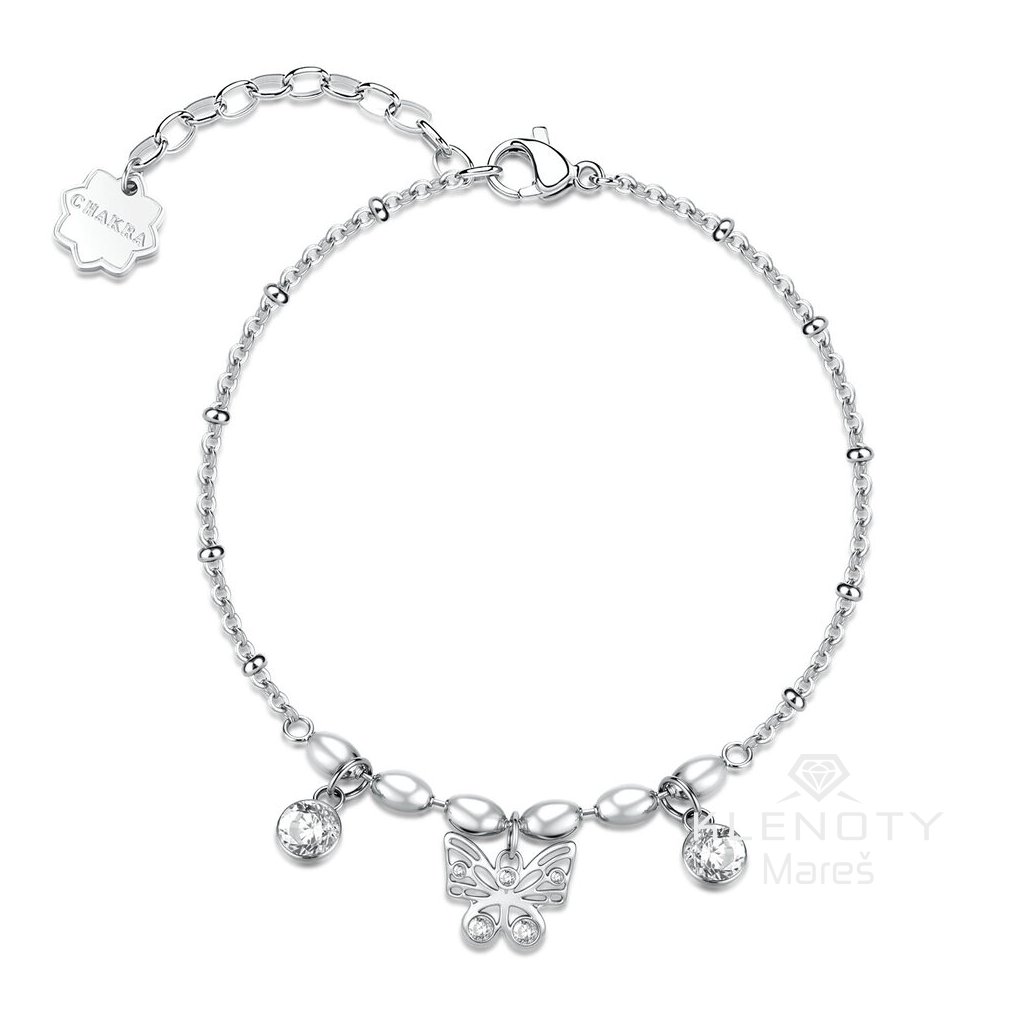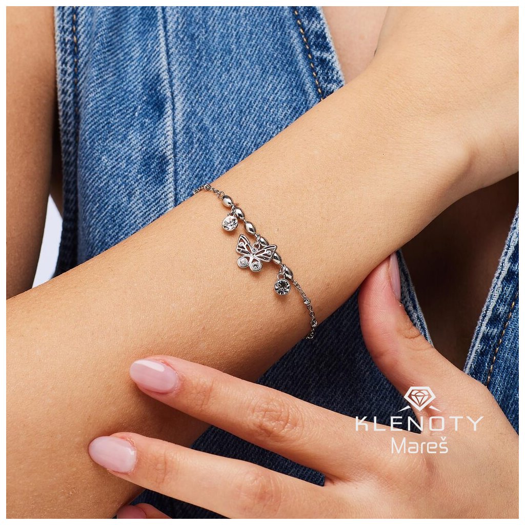 Něžný dámský ocelový náramek je elegantní doplněk pro ženy, který kombinuje styl a sílu, zdobený třpytivými čirými krystaly, půvabná ozdoba ve tvaru motýla.