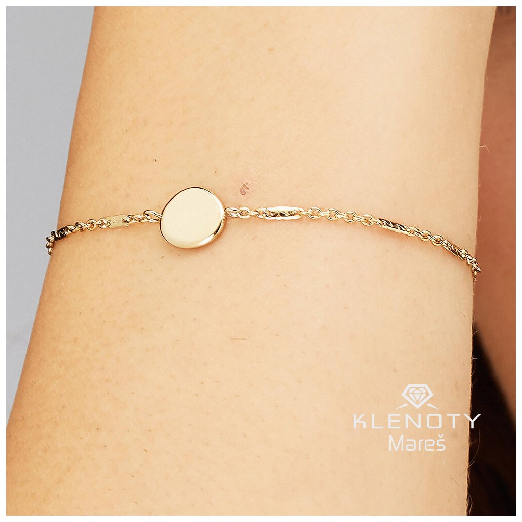 Dámský ocelový náramek s placičkou ve žluté povrchové úpravě.
