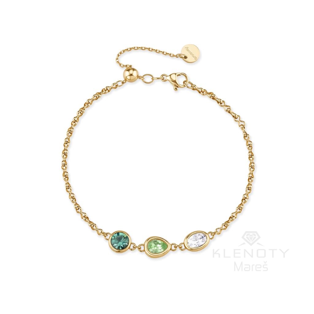 Objevte šperk, který v sobě snoubí italský temperament a nadčasovou eleganci. Náramek z kolekce Symphonia vás okouzlí trojicí precizně vybroušených krystalů v osvěžujících odstínech zelené a čiré. Každý kámen má jiný tvar – od klasického kulatého přes jemnou kapku až po elegantní ovál – což dodává šperku unikátní dynamiku.