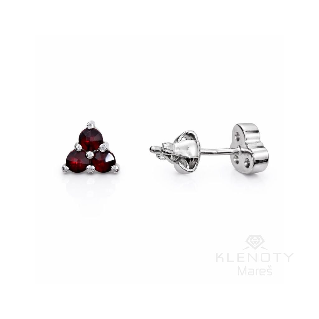 Stříbrné náušnice osázené Českým granátem v motivu trojúhelníka na puzetové zapínání.