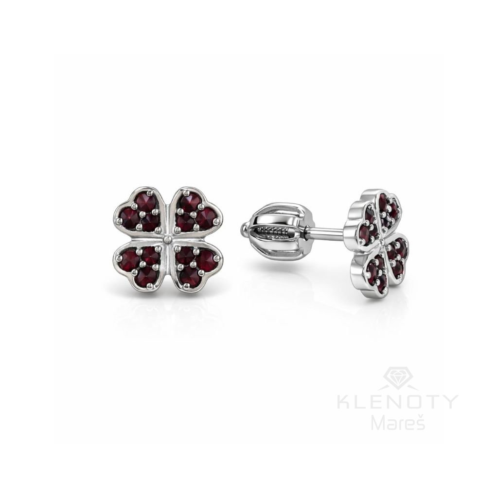 Stříbrné náušnice osázené Českým granátem v motivu čtyřlístku.