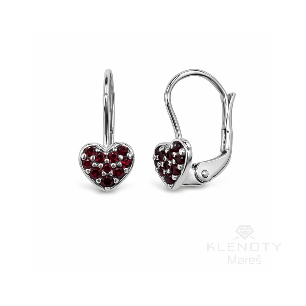 Stříbrné náušnice osázené Českým granátem v motivu srdíčka.