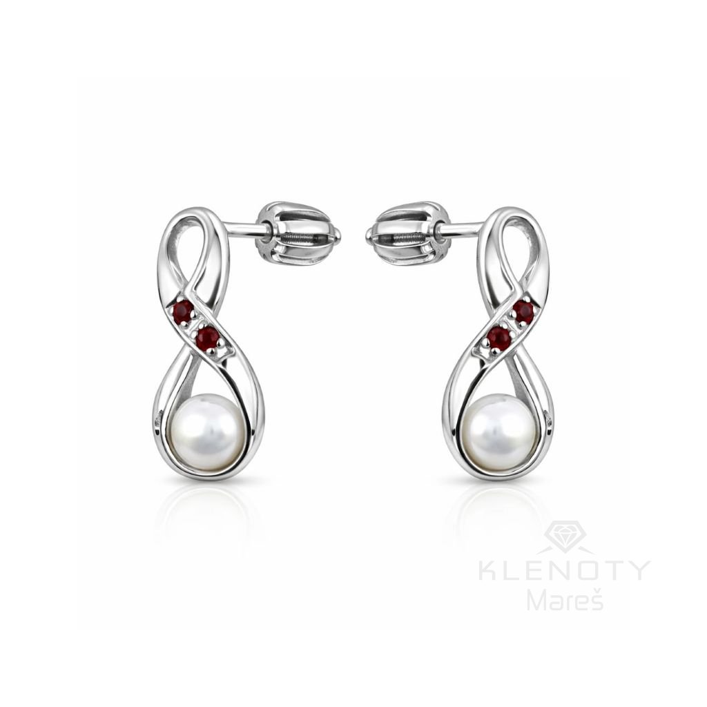 Stříbrné náušnice osázené Českým granátem a perlou, motivem nekonečna na šroubkové zapínání.