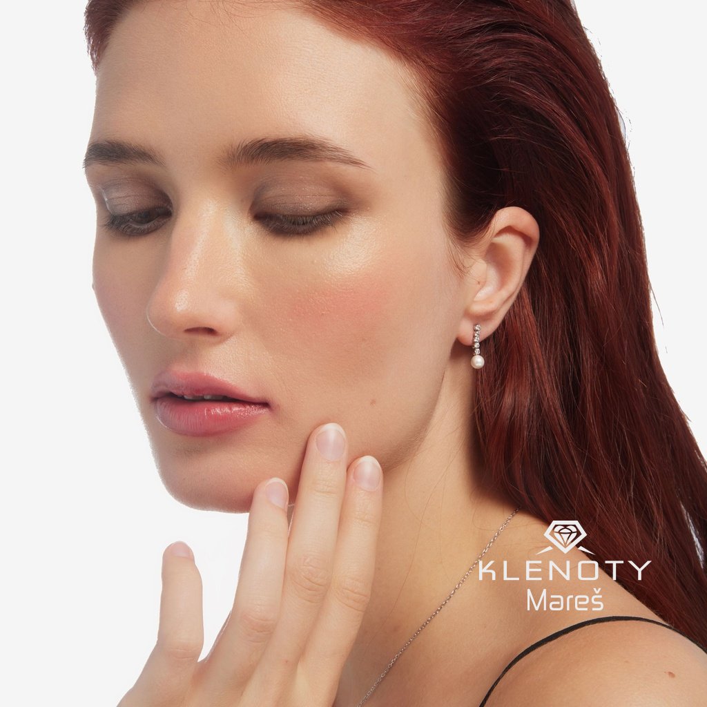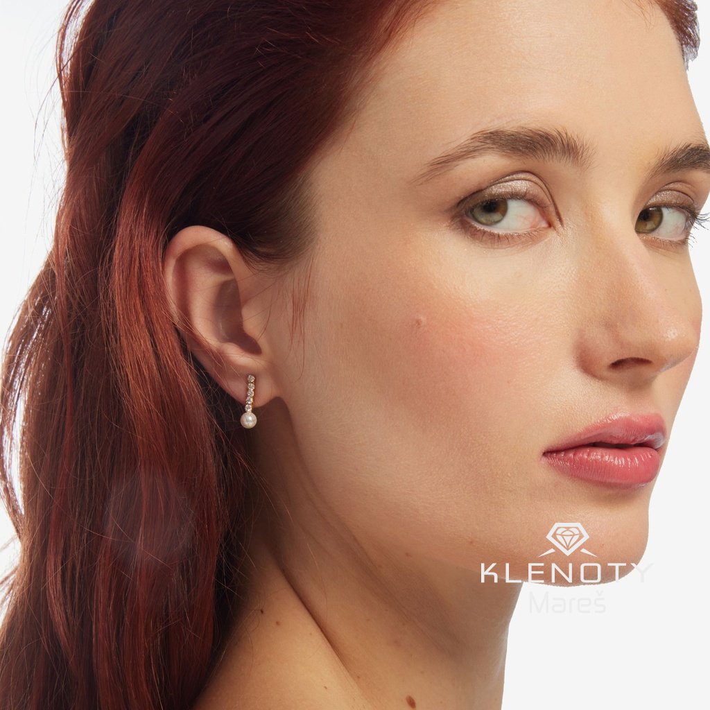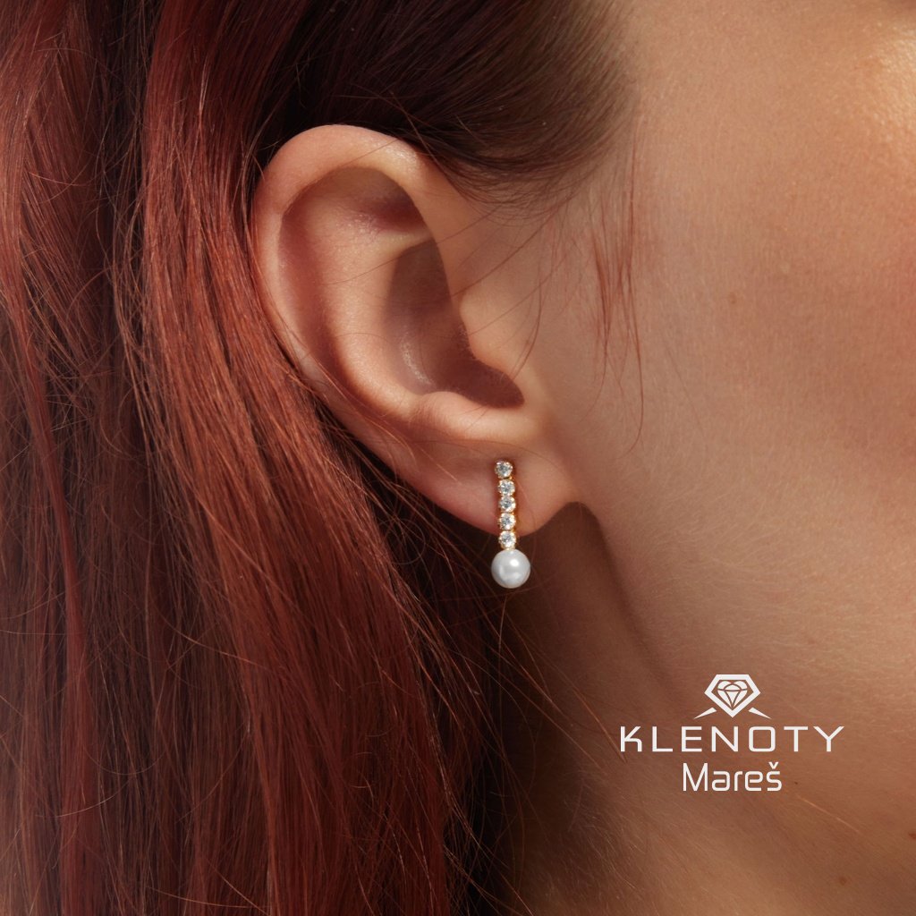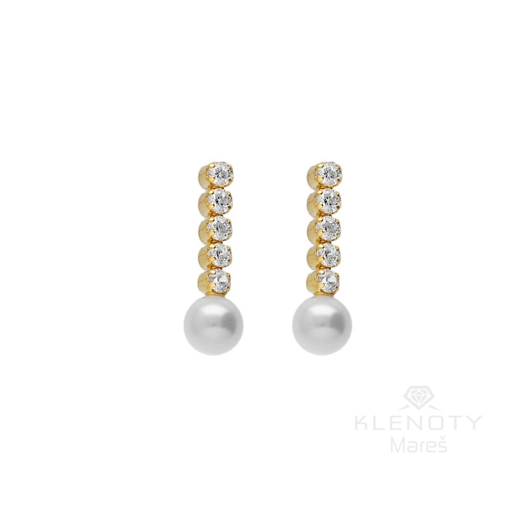 Stříbrné elegantní náušnice pozlacené 18ti karátovým zlatem na puzetové zapínání s třpytivými zirkony ukončené perličkou.