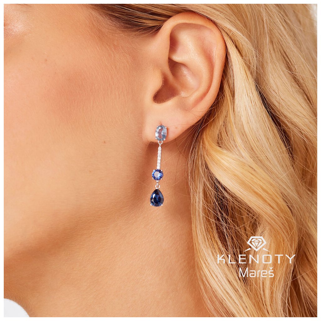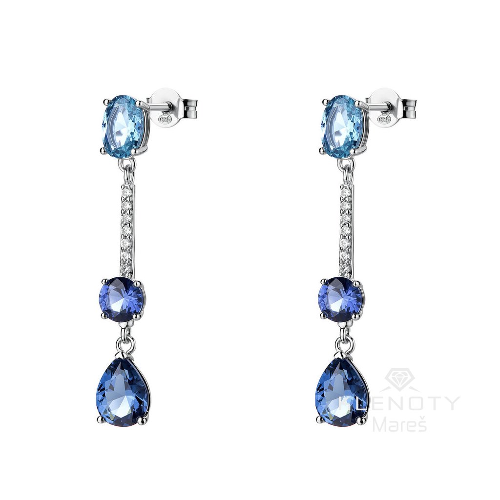 Oslnivé dlouhé náušnice ozdobené vybroušenými modrými a čirými kubickými zirkony, usazenými v krápnách.