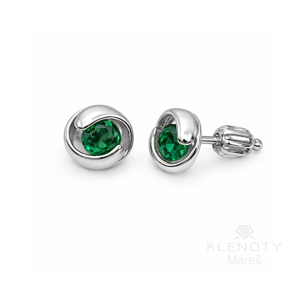 Stříbrné náušnice mají elegantní a moderní design, který tvoří plynulá linie stříbra připomínající vlnu nebo jemné objetí, v jehož středu je usazen výrazný zelený zirkon