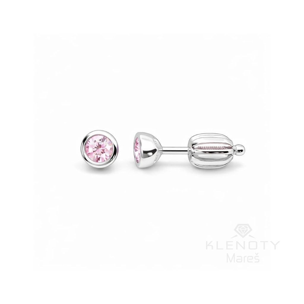 Stříbrné náušnice na šroubkové zapínání zdobené růžovým zirkonem.