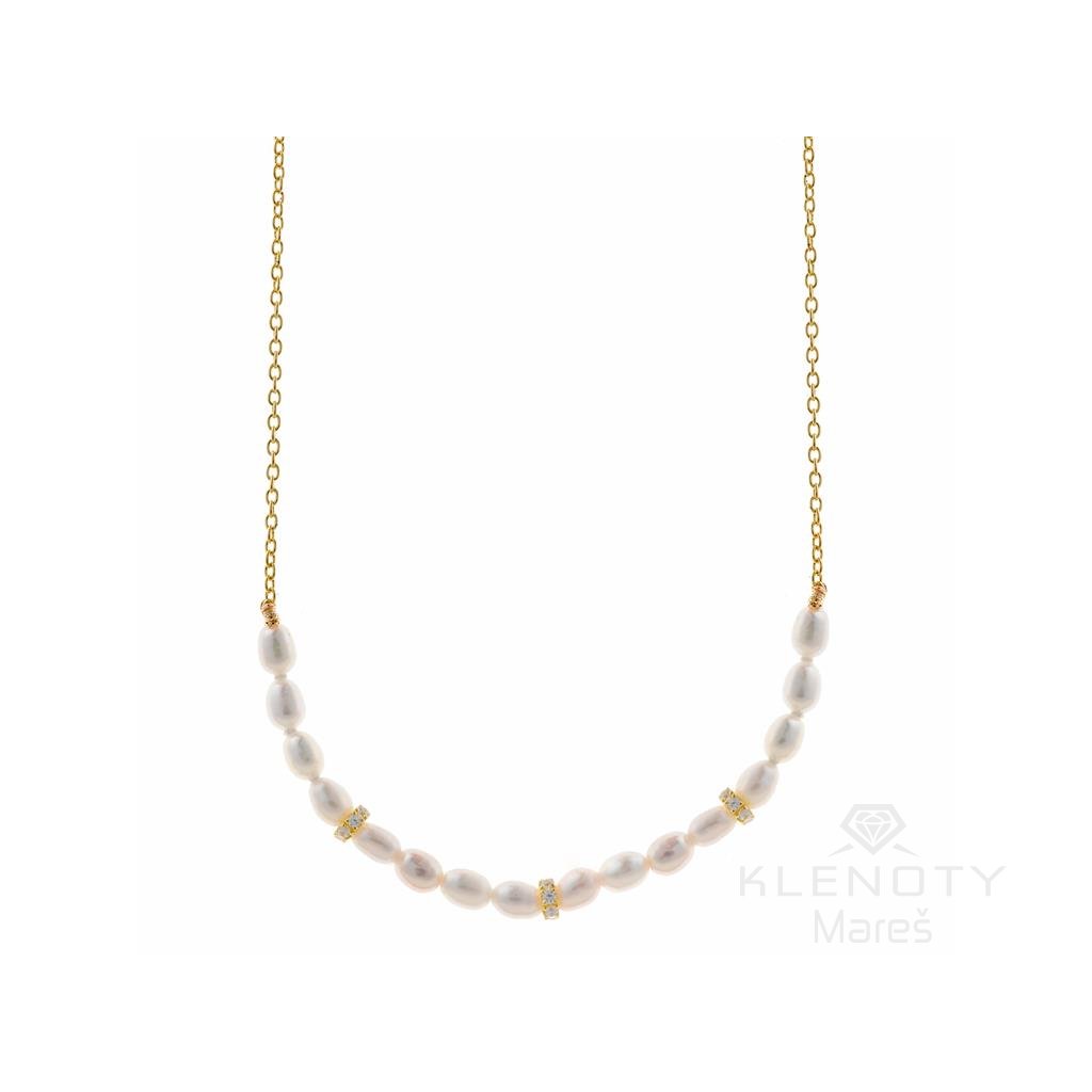 Stříbrný elegantní náhrdelník pozlacený 18ti karátovým zlatem s perličkami zdoben třpytivými krystaly.