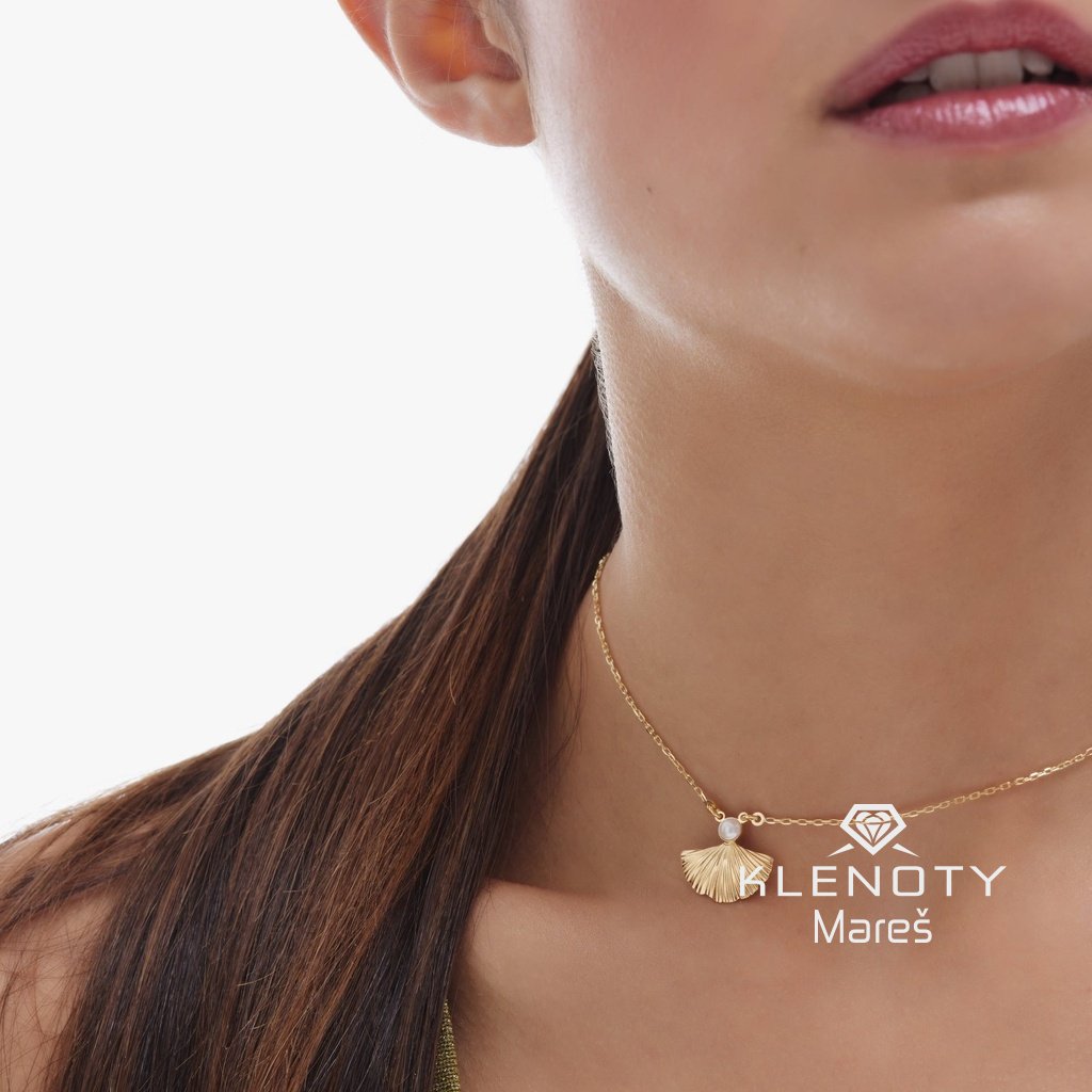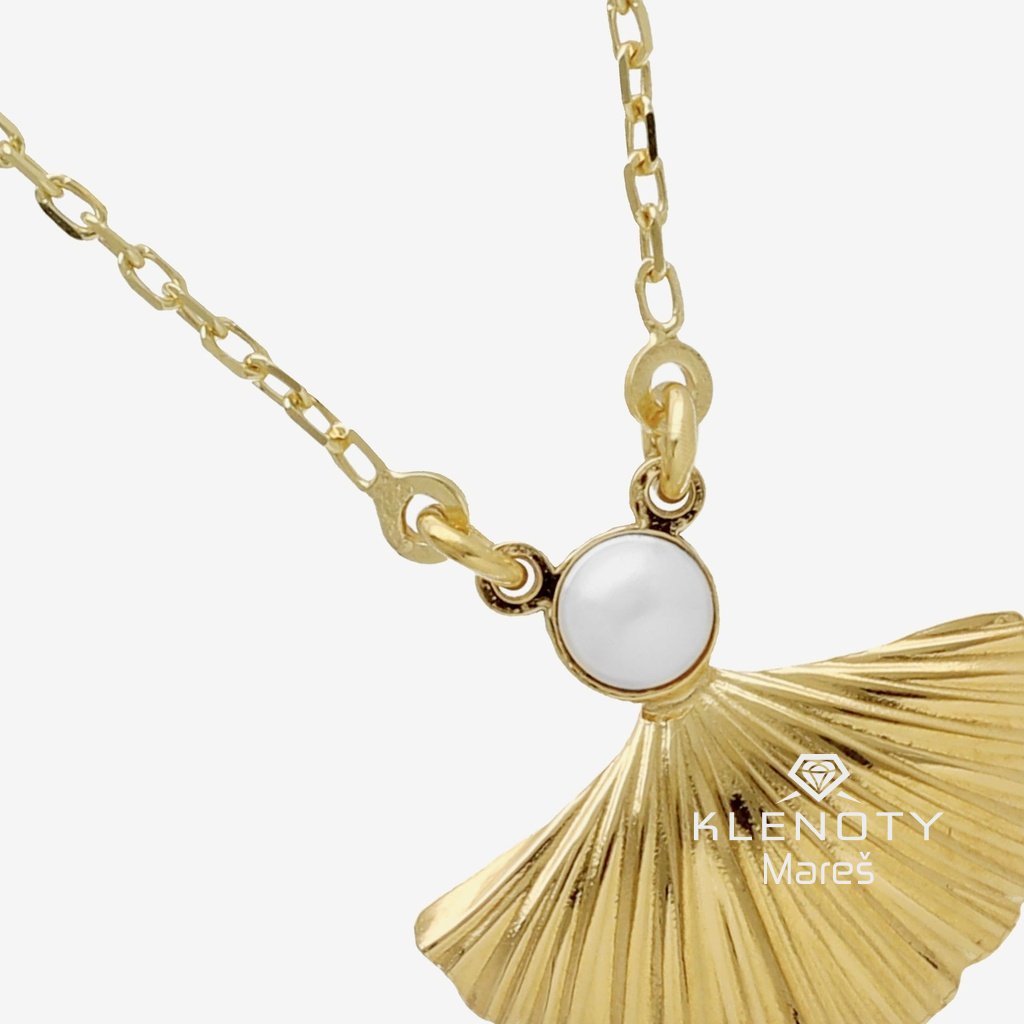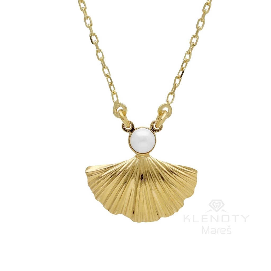 Stříbrný elegantní pozlacený náhrdelník ve 18ti karátovým zlatě s motivem mušle a perličkou.