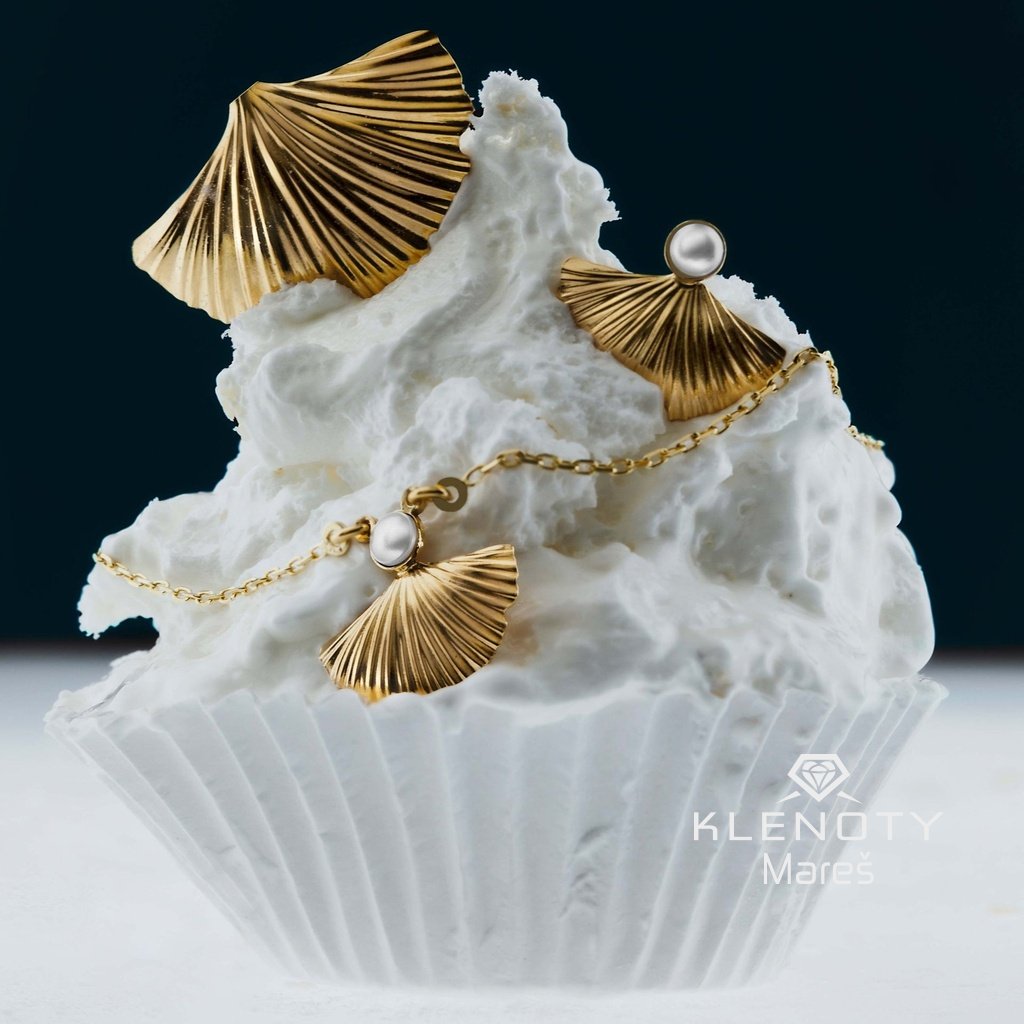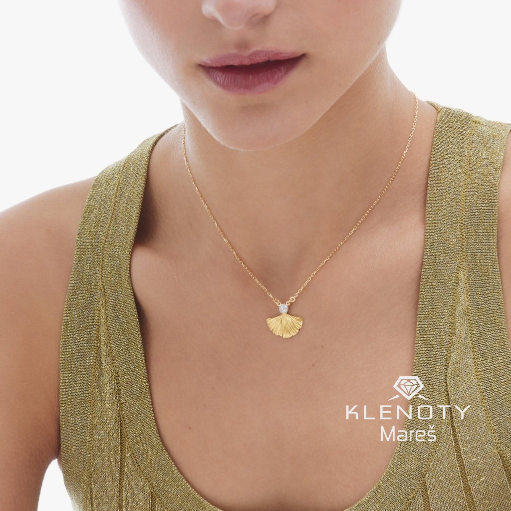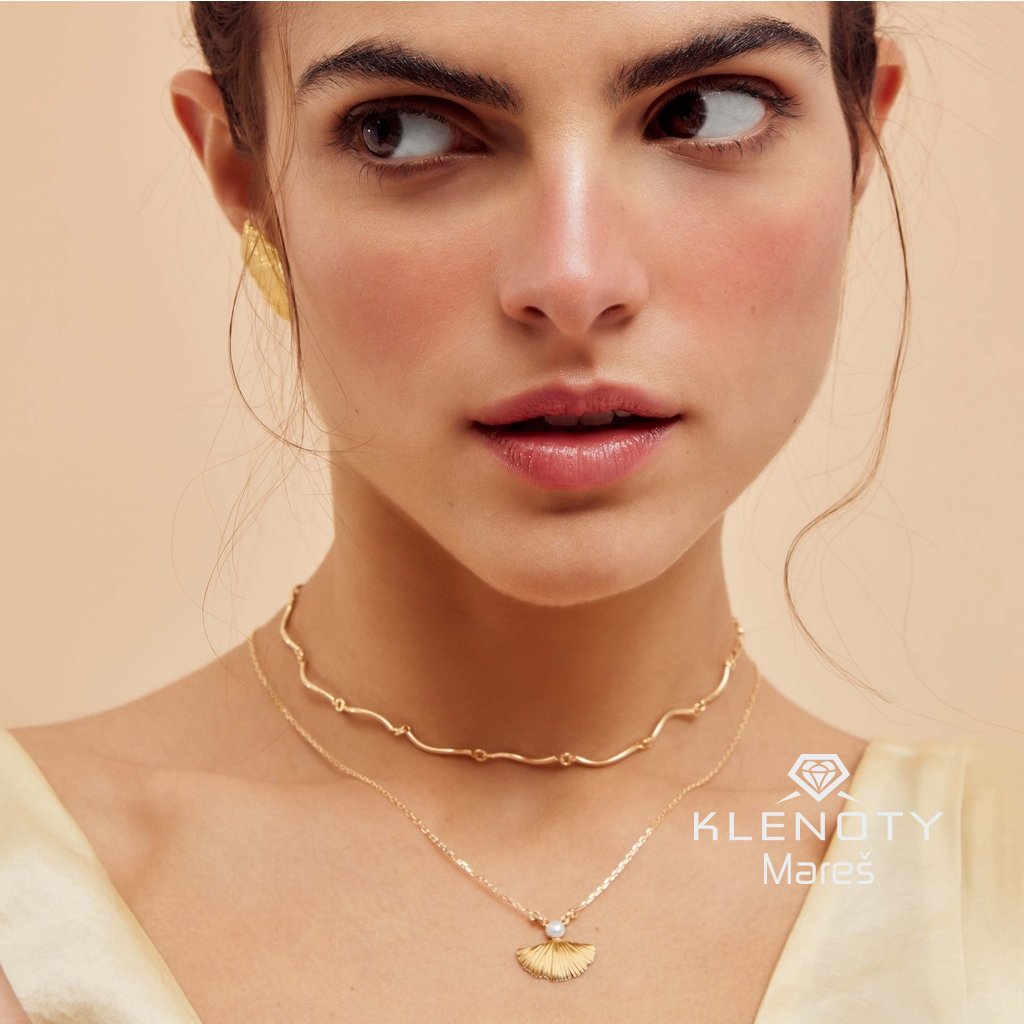Stříbrný elegantní pozlacený náhrdelník ve 18ti karátovým zlatě s motivem mušle a perličkou.