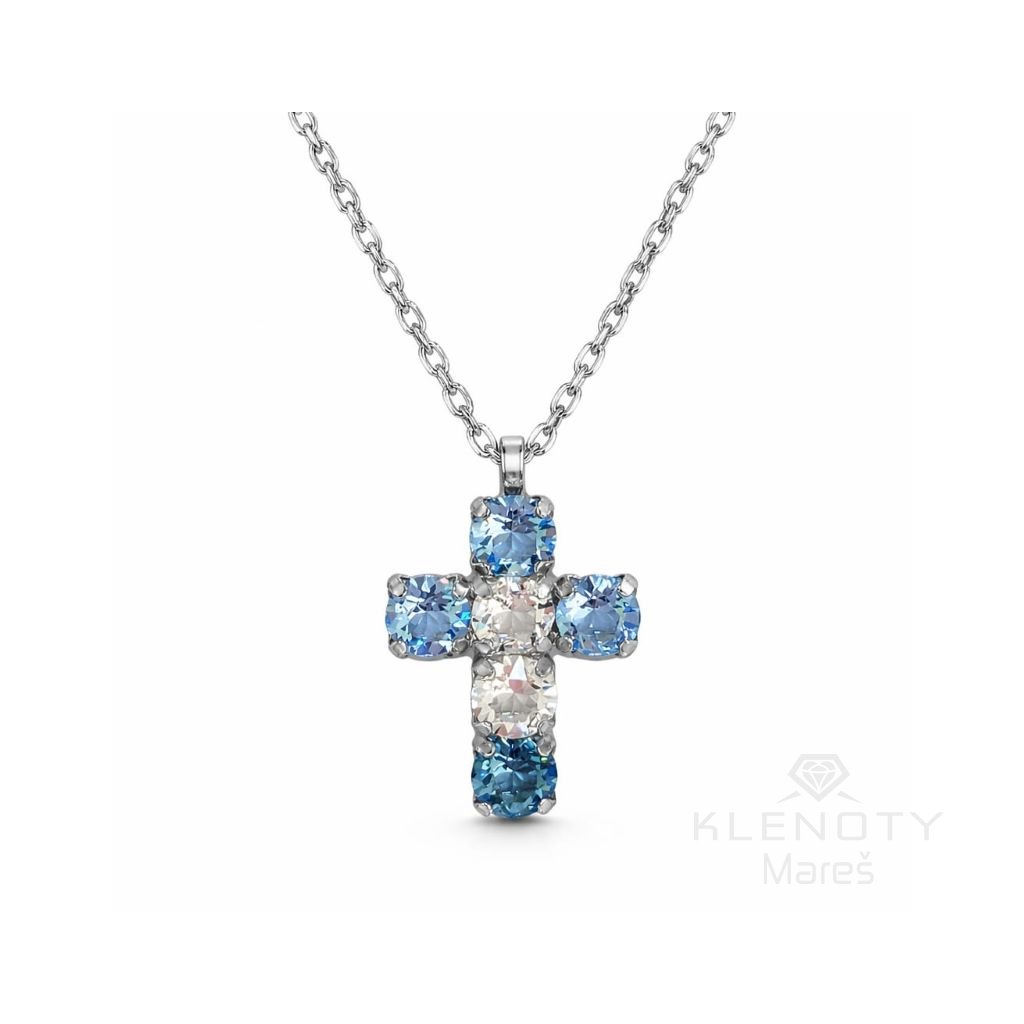 Stříbrný elegantní náhrdelník v motivu kříž v odstínech modré.