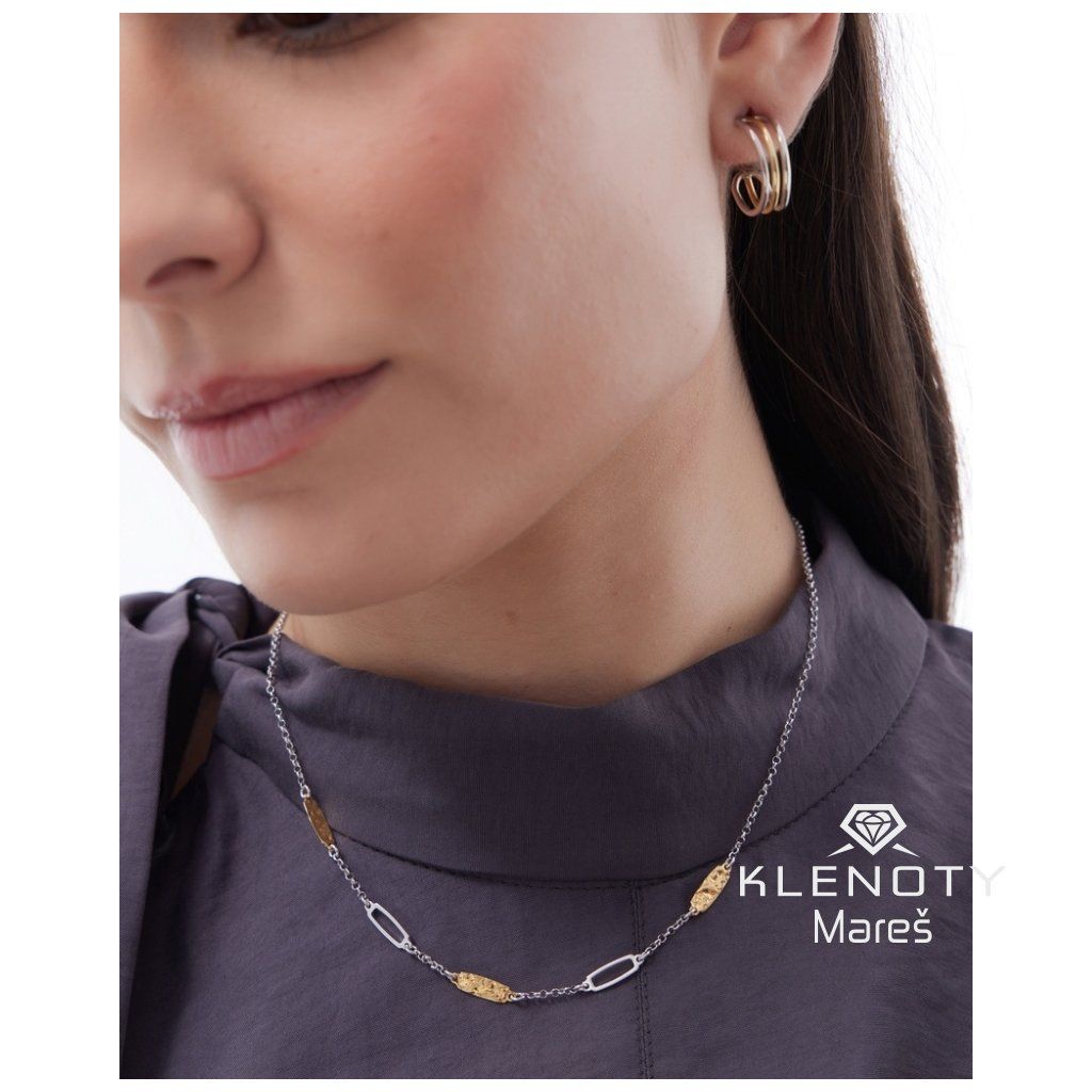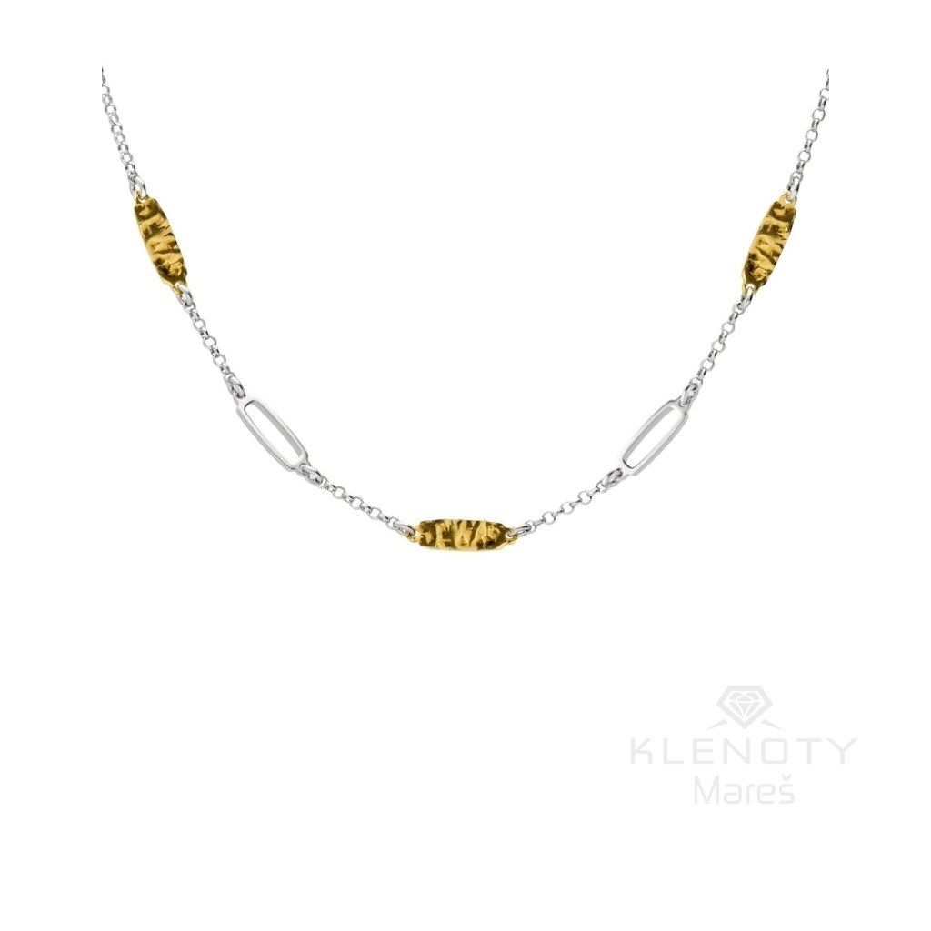 Centrálním prvkem jsou nepravidelné články s organickým povrchem, které připomínají ryzí zlato ve své surové, přírodní kráse. Jejich zlatý lesk vytváří luxusní kontrast k jemnému stříbrnému řetízku. Navzdory svému výraznému vzhledu působí na krku vzdušně a lehce, takže je perfektním společníkem pro celodenní nošení.
