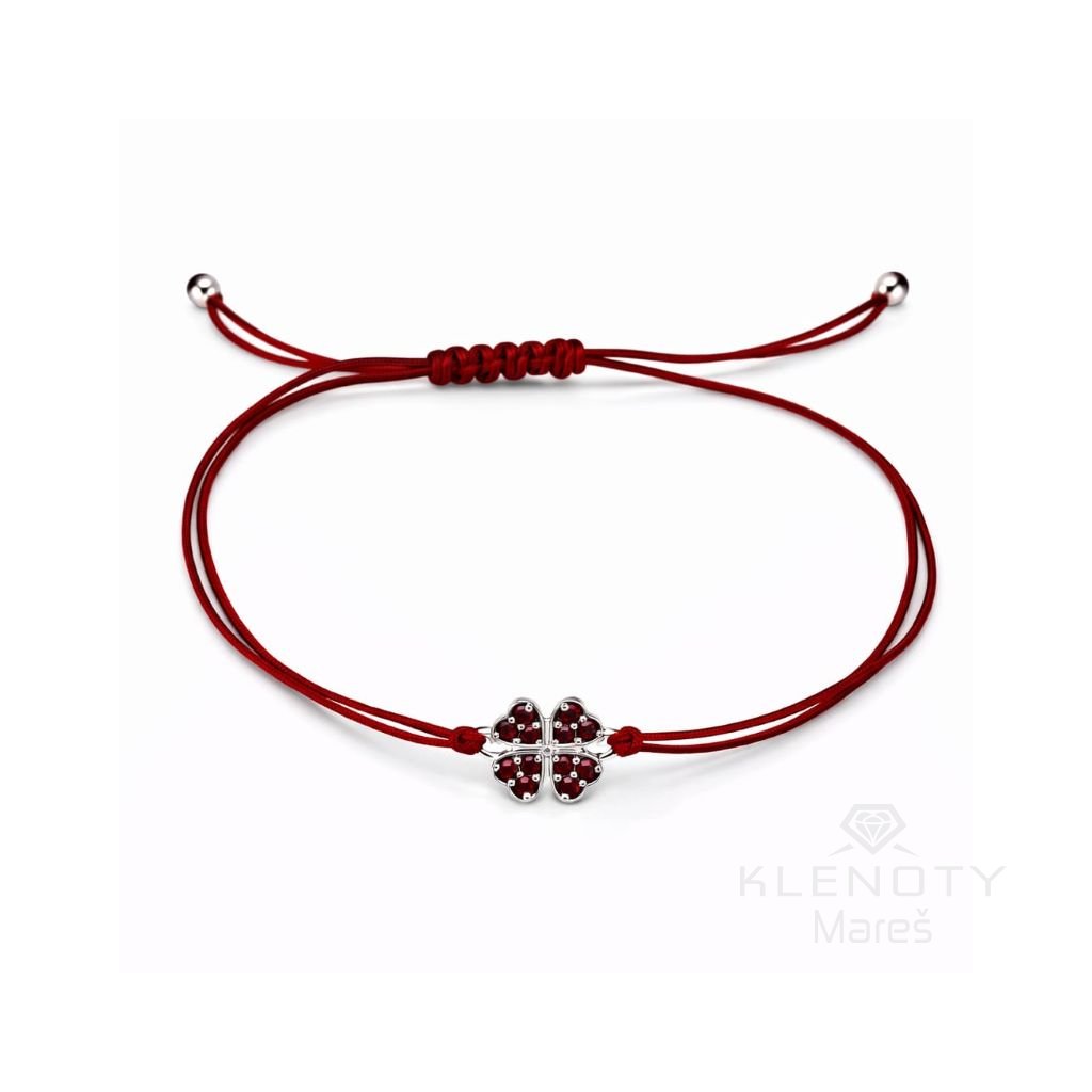 Stříbrný minimalistický náramek na šňůrce osázený Českým granátem v motivu čtyřlístku.