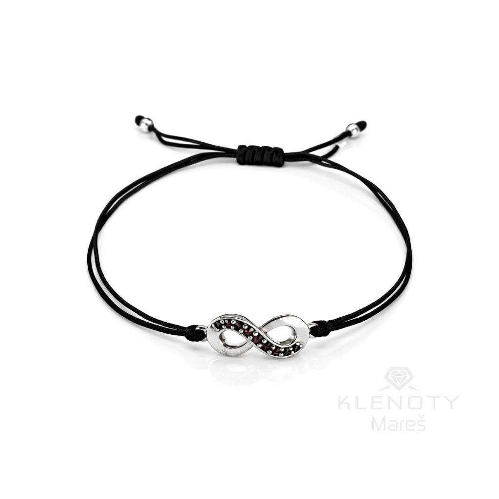 Stříbrný minimalistický náramek na šňůrce osázený Českým granátem v motivu nekonečna.