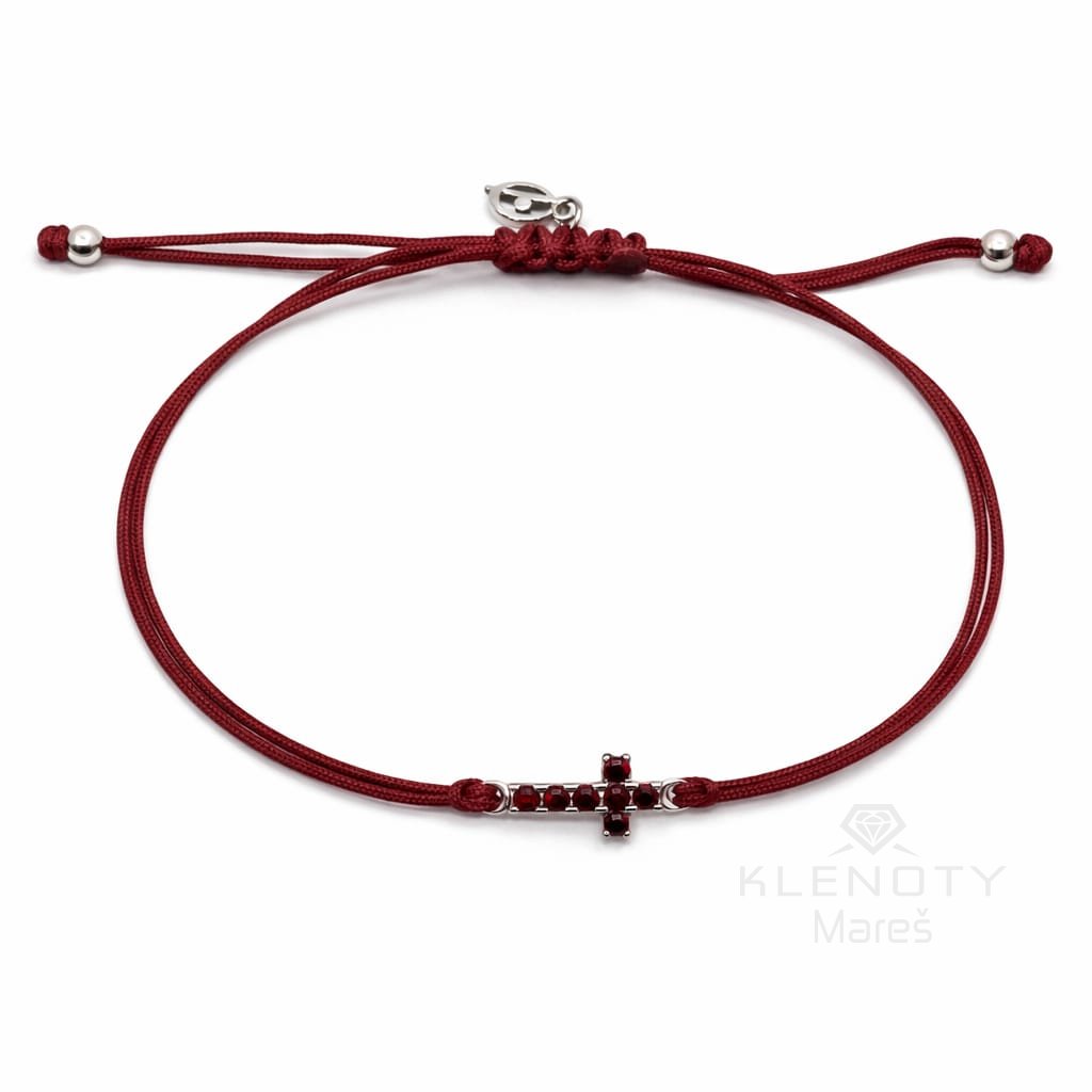 Stříbrný minimalistický náramek na šňůrce osázený Českým granátem v motivu křížku.