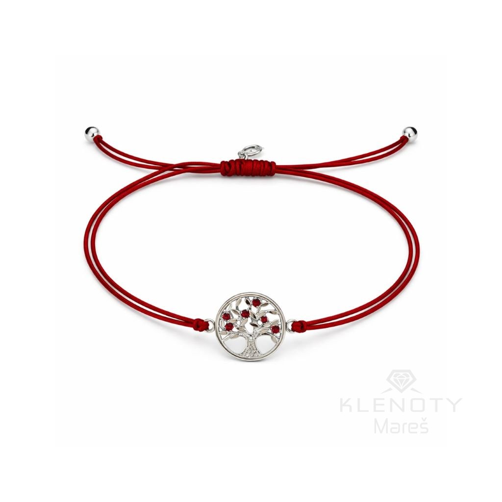 Stříbrný minimalistický náramek na šňůrce osázený Českým granátem v motivu strom života.