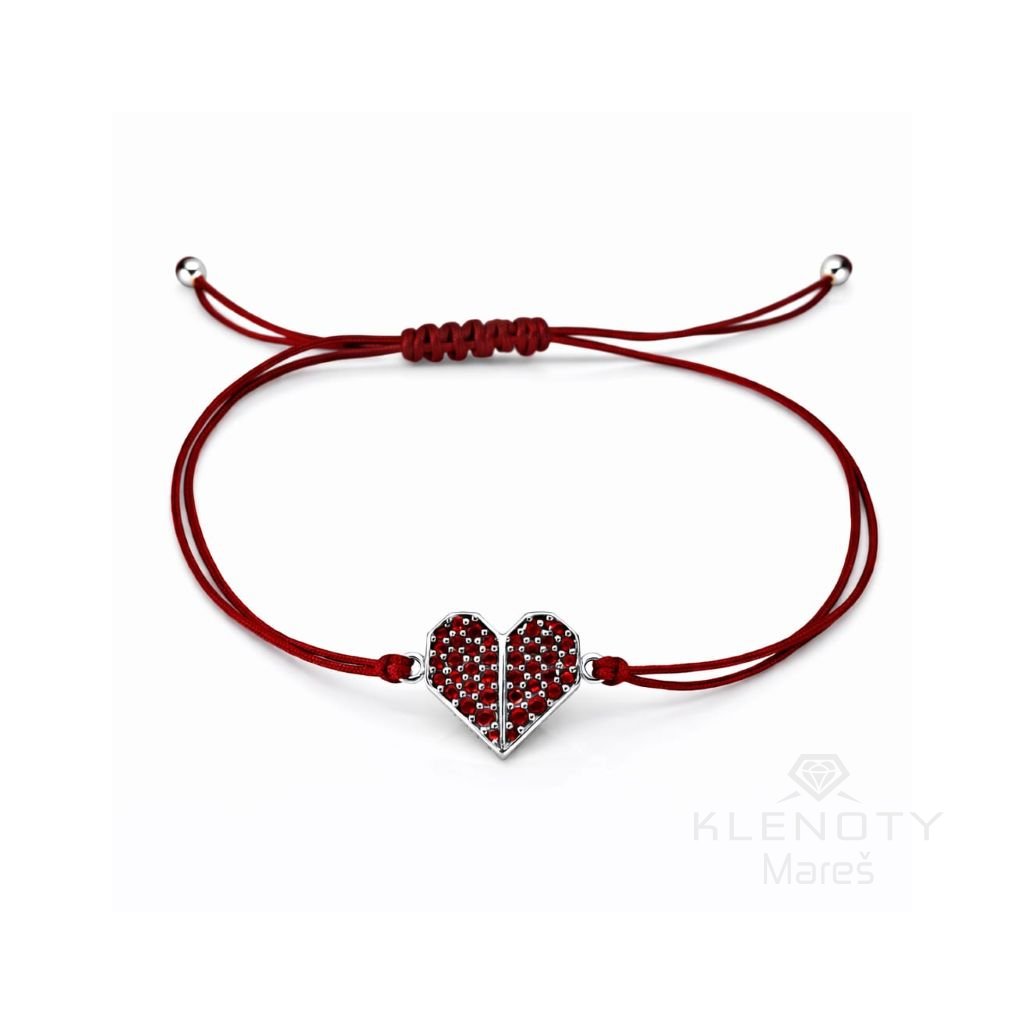 Stříbrný minimalistický náramek na šňůrce osázený Českým granátem v motivu srdce.