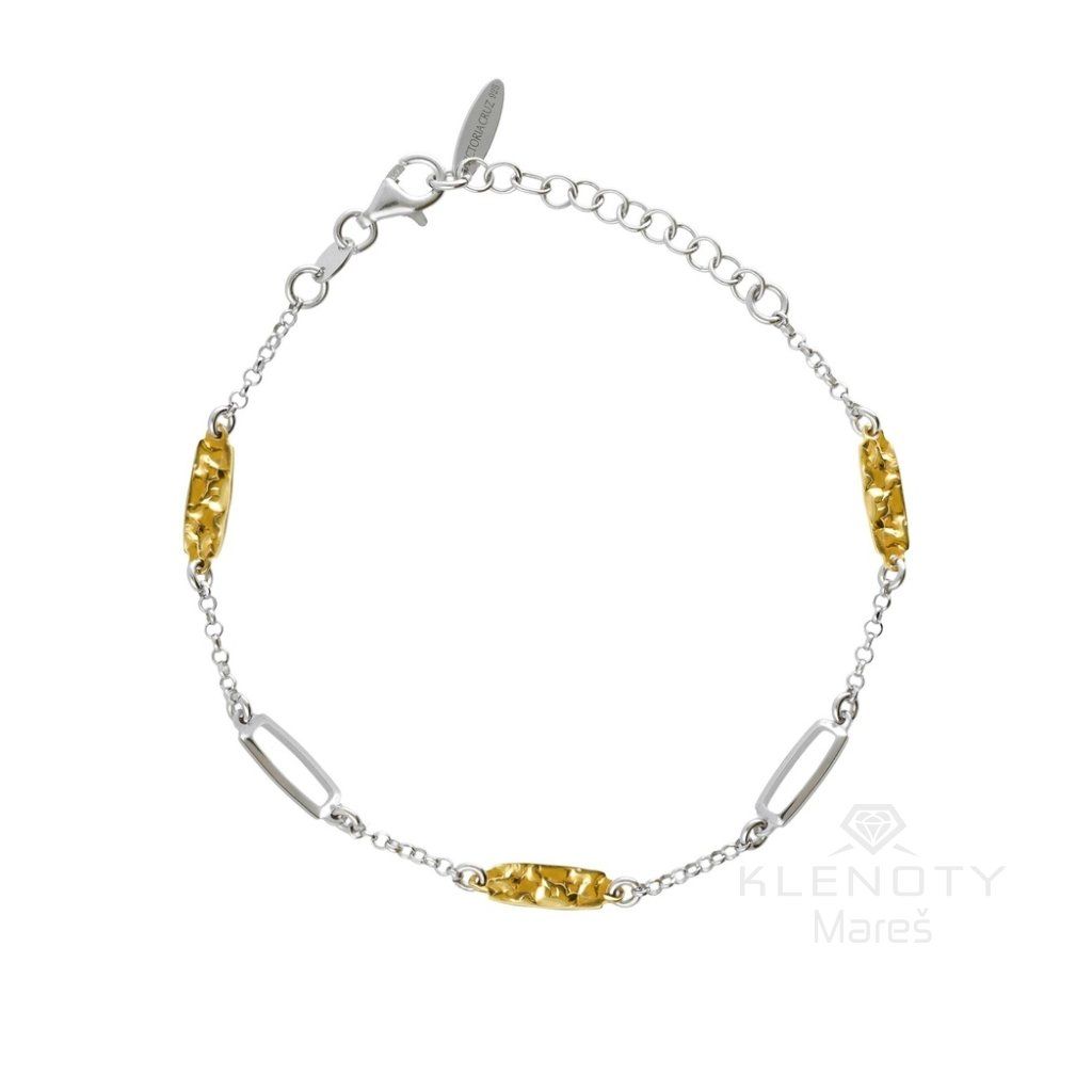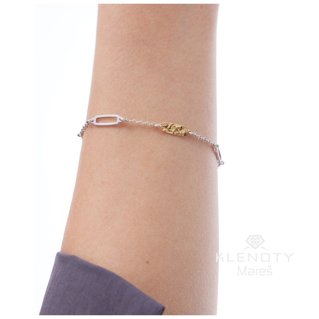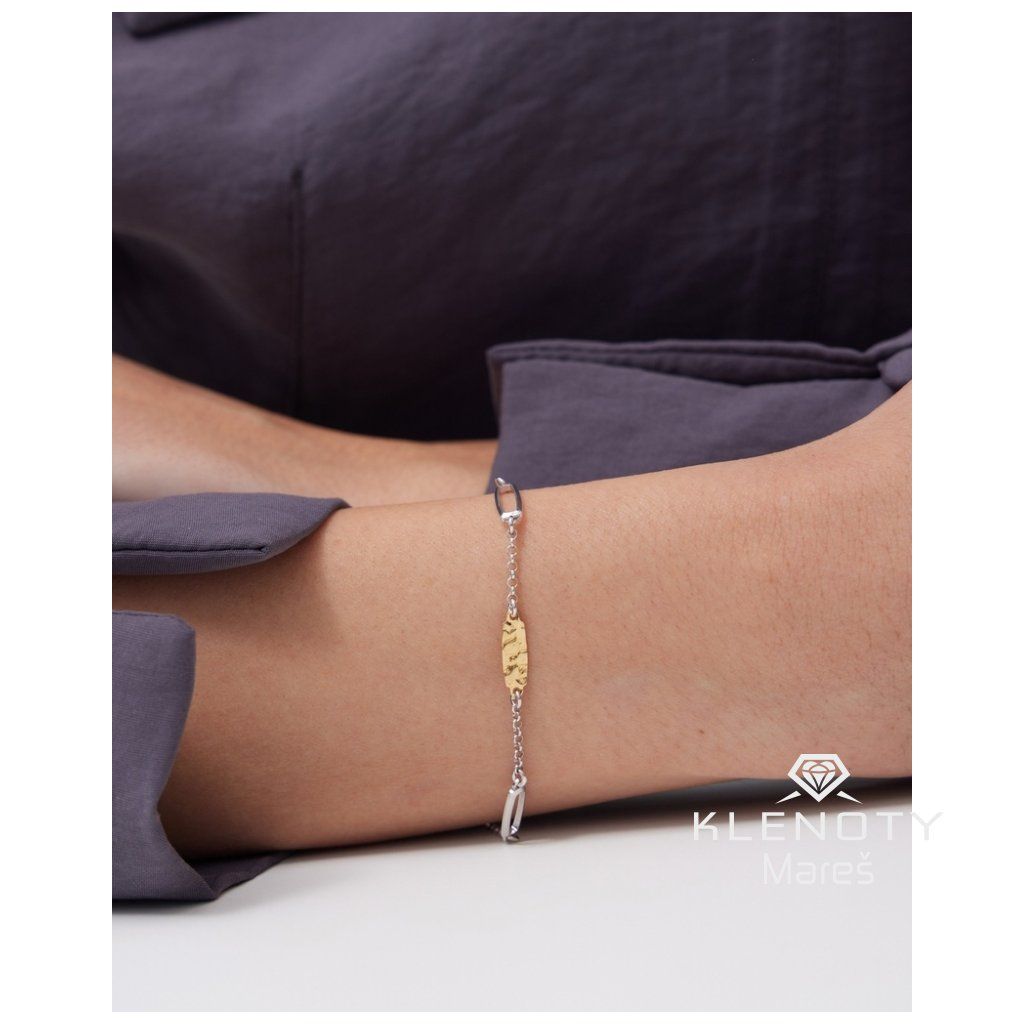 Zlaté články s efektem „tepaného kovu“ odrážejí světlo z různých úhlů a dodávají šperku hloubku a syrovou, přírodní krásu. Díky dvoubarevnému provedení se náramek skvěle kombinuje s dalšími zlatými i stříbrnými šperky z vaší sbírky.