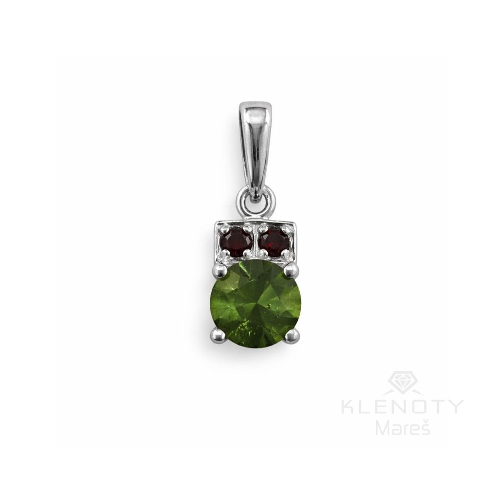 Stříbrný přívěs osázený Českým granátem a Vltavínem.