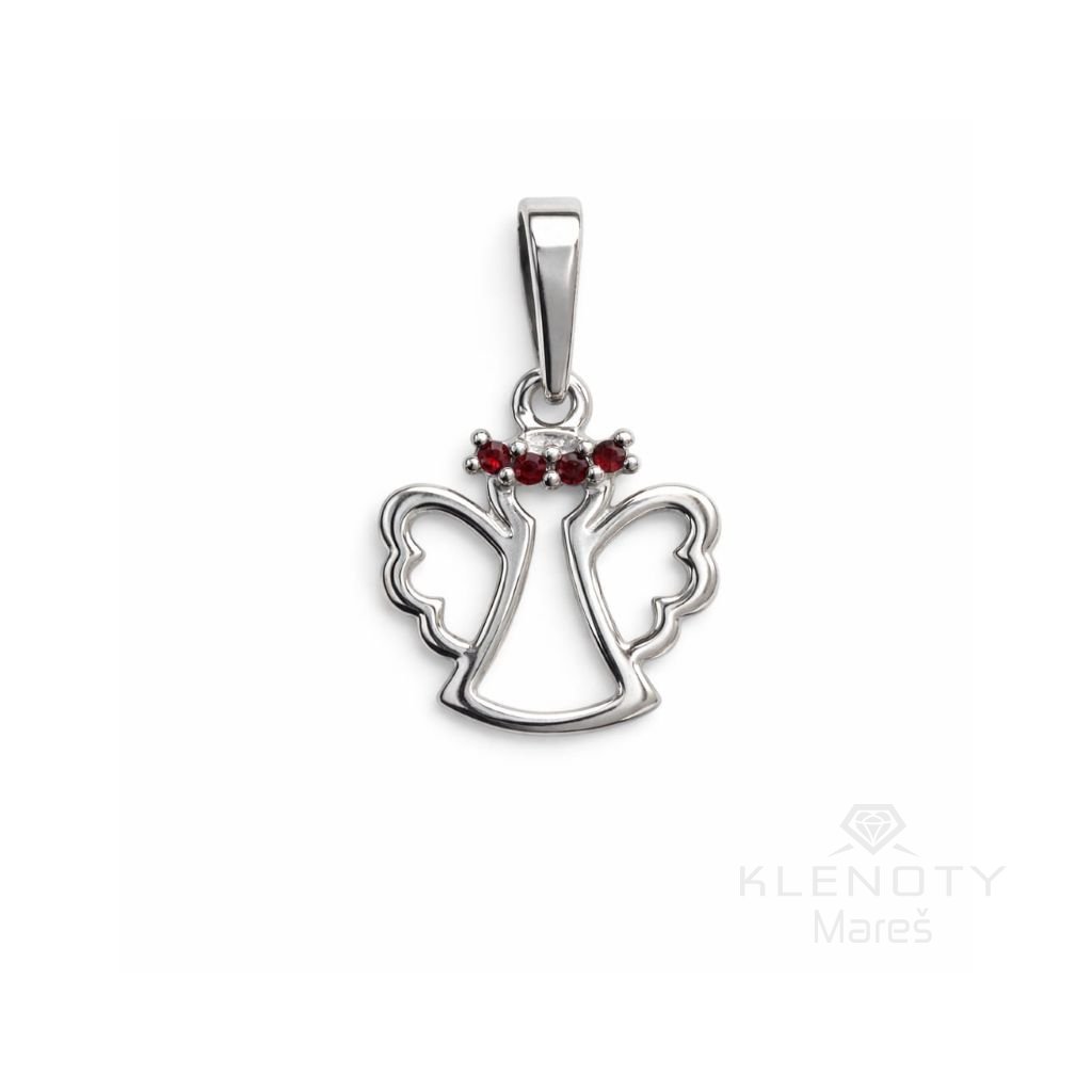 Stříbrný přívěs s motivem andílka, který zdobí český granát.