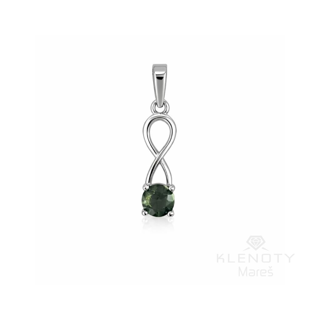 Moderní stříbrný přívěs osázený Vltavínem v motivu nekonečna.