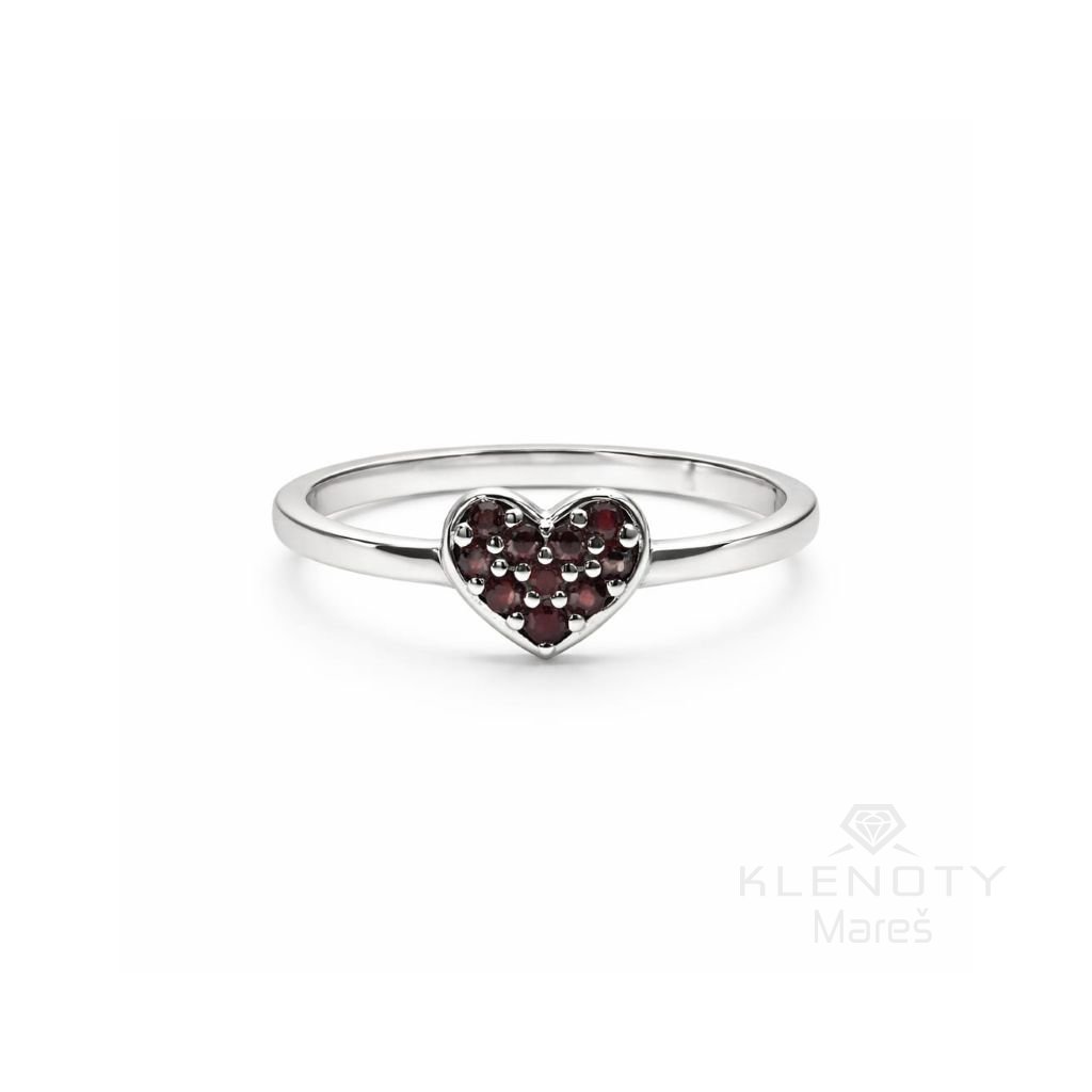 Elegantní stříbrný prsten osázený Českým granátem motivu srdce.