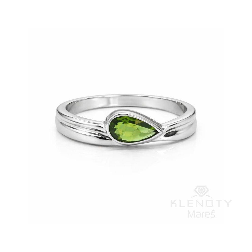 Elegantní stříbrný prsten s centrálním kamenem vltavínem do tvaru slzy.