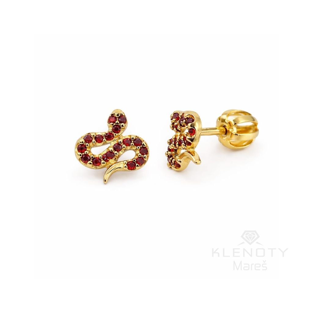 Elegantní náušnice ze 14ti karátového zlata na šroubek osázené Českým granátem v motivu hada.