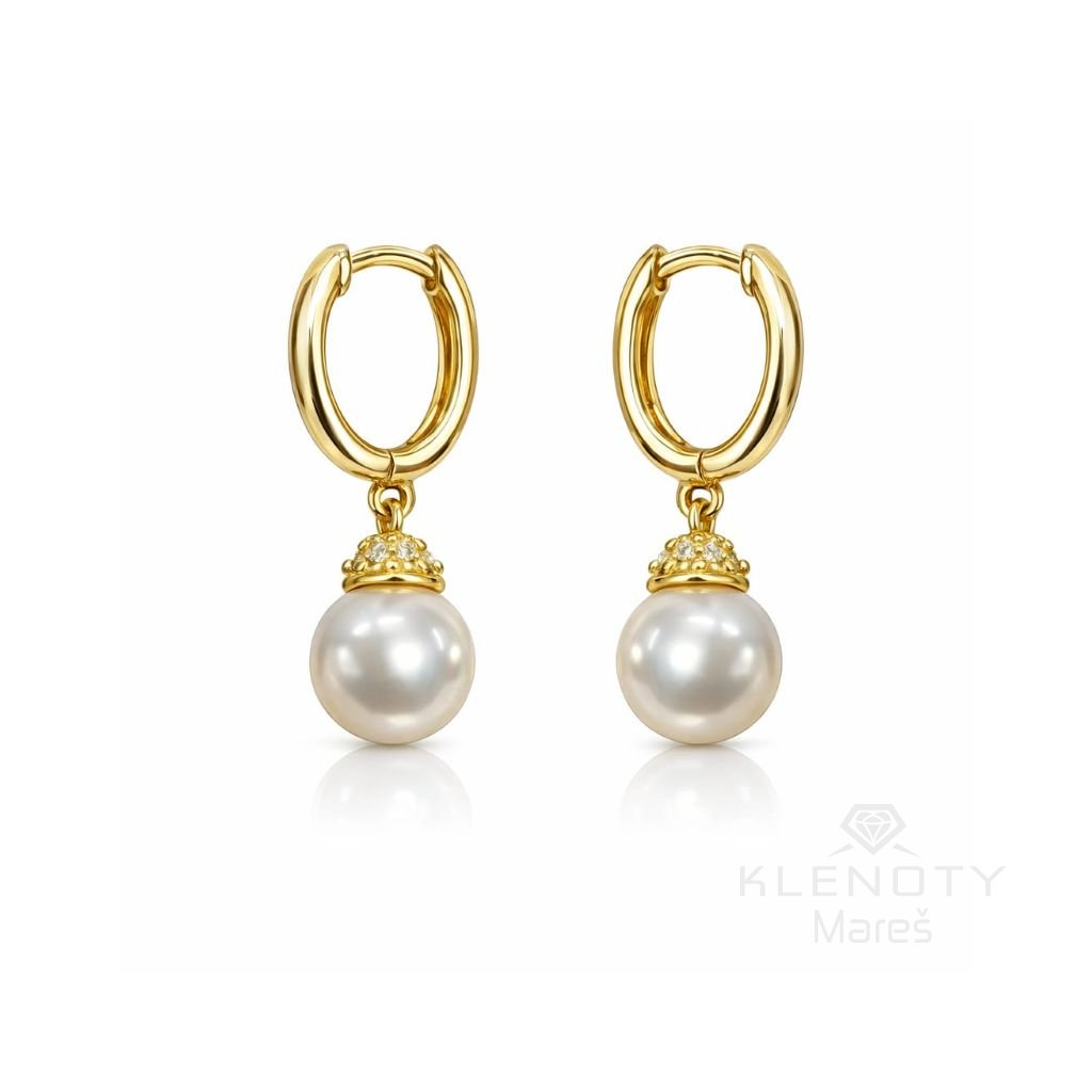 Visací náušnice ze 14ti karátového zlata zdobené říční perlou a zirkony.
