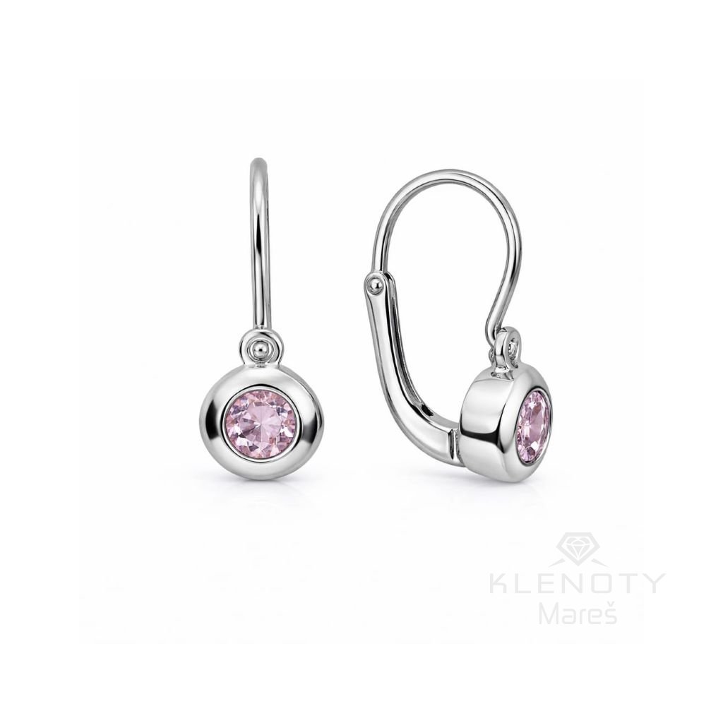 Zlaté dětské náušnice zdobeným růžovým zirkonem na přední zapínání.