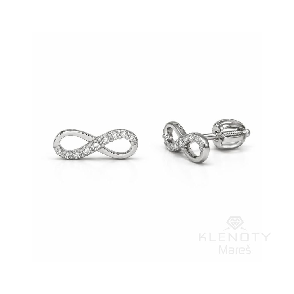 Minimalistické náušnice ze 14ti karátového bílého zlata se zapínáním formou šroubku v motivu nekonečna.