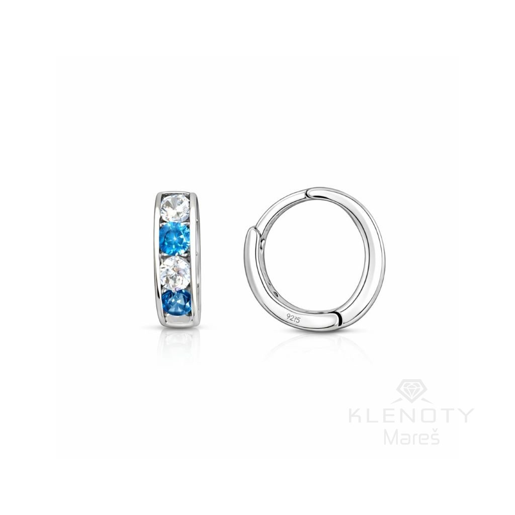 Minimalistické kruhové náušnice ze 14ti karátového bílého zlata zdobené modrými třpytivými zirkony.