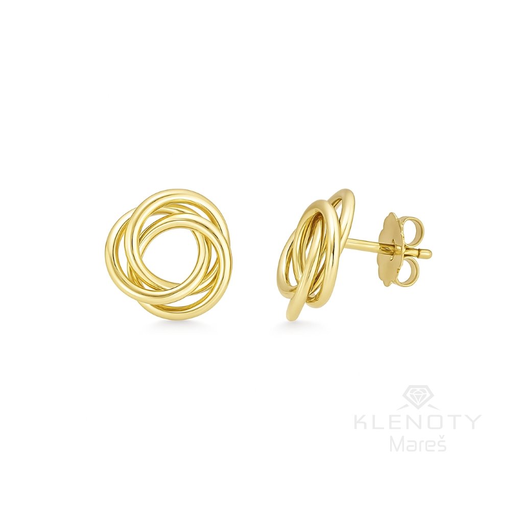 Zlaté náušnice ve tvaru spojených kroužku na puzetové zapínání.
