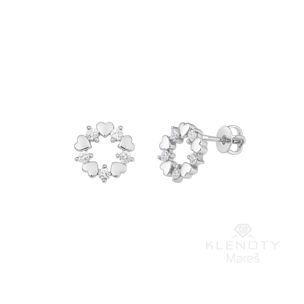 Moderní náušnice ze 14ti karátového zlata v motivu kolečka zdobené zirkony a srdíčky.
