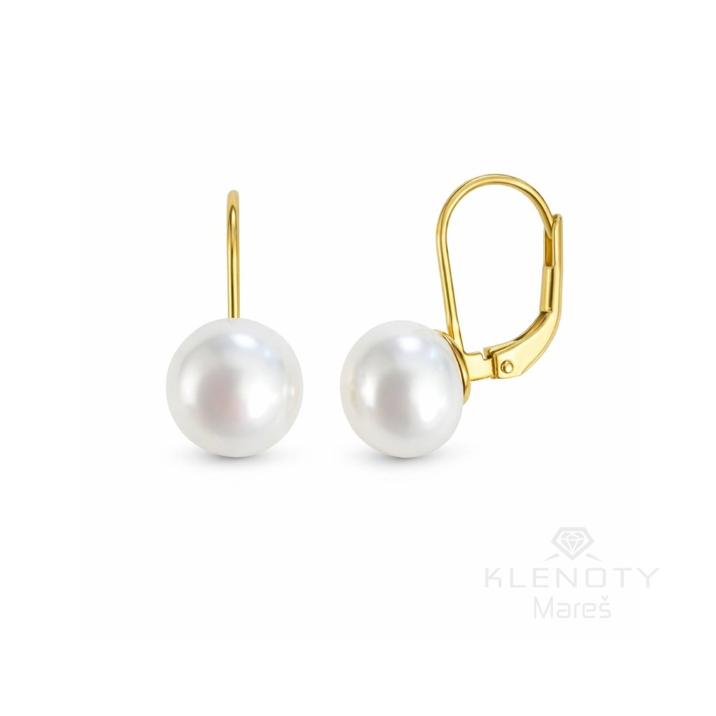 Moderní náušnice ze 14ti karátového zlata zdobené říční perlou.