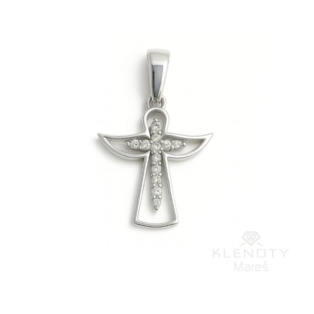 Minimalistický přívěsek ve 14ti karátovém bílém zlatě v motivu andílka, který je zdoben zirkony.