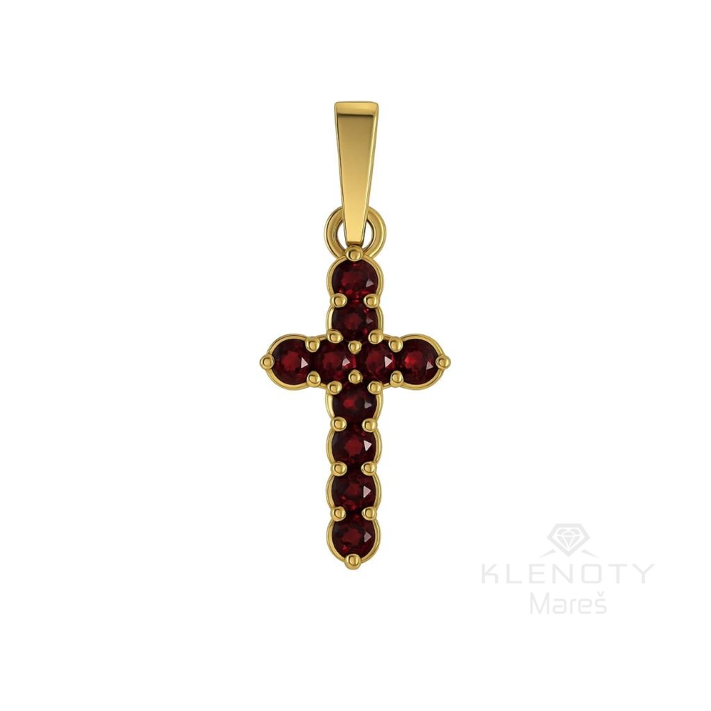 Zlatý přívěs s motivem křížku ve 14ti karátovém zlatě, který je osázen českým granátem.