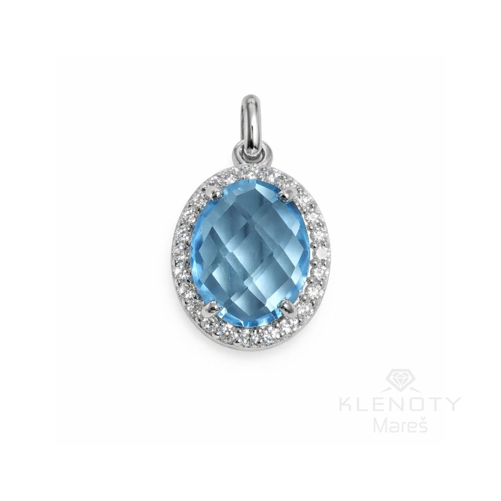 Elegantní přívěsek ve 14ti karátovém bílém zlatě se třpytivými zirkony s centrálním akvamarínem.