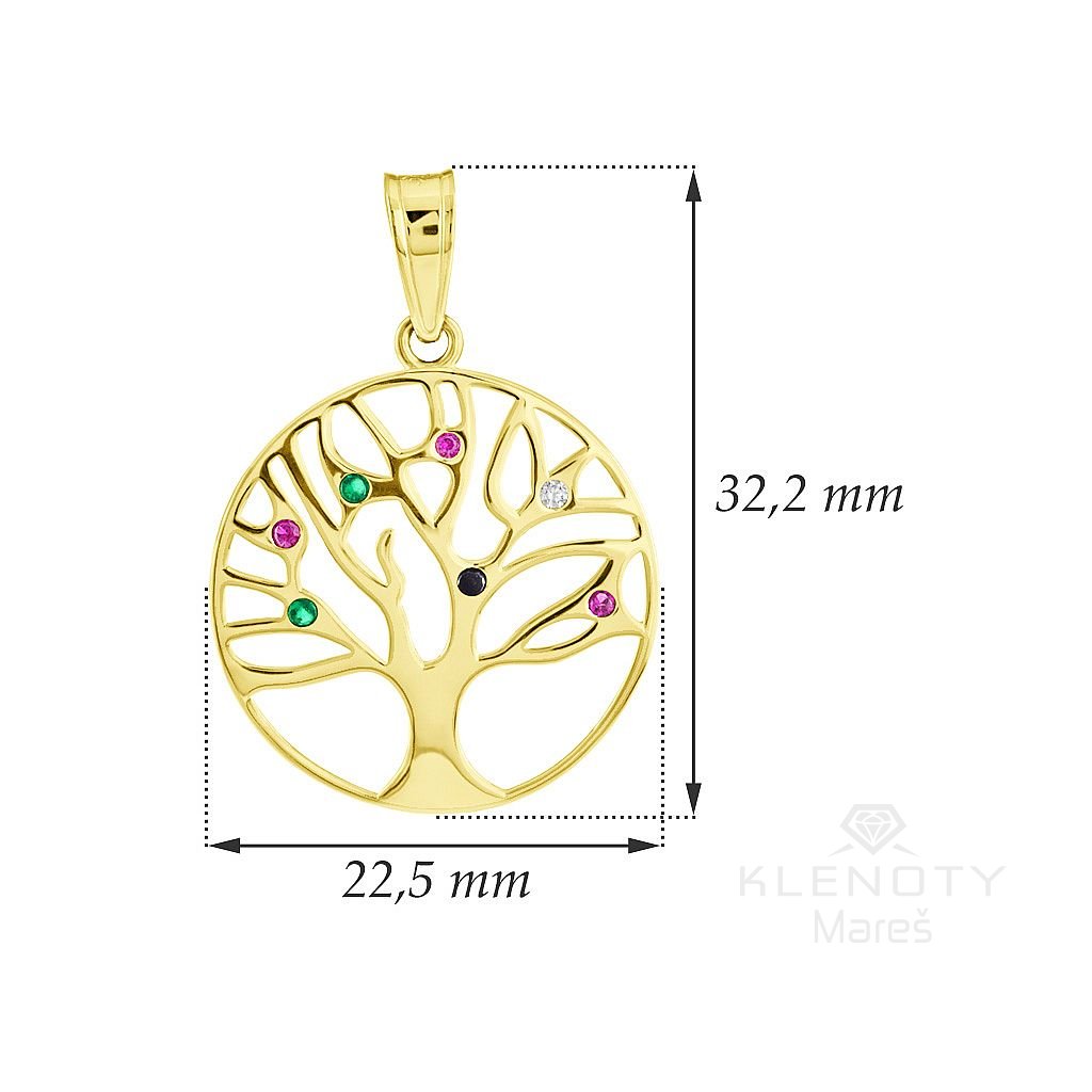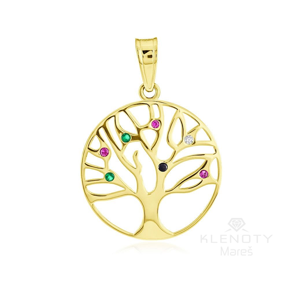 Zlatý minimalistický přívěsek v motivu strom života osázený barevnými zirkony.